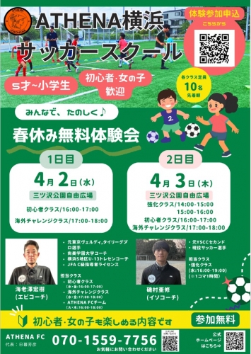 ATHENA横浜春休み無料体験会4/2(水),3(木)@三ツ沢公園自由広場 ■海老澤コーチ 初心者クラス 海外チャレンジクラス ■磯村コーチ 強化クラス 未経験者、初心者、女の子大歓迎! 楽しい!上手くなる!