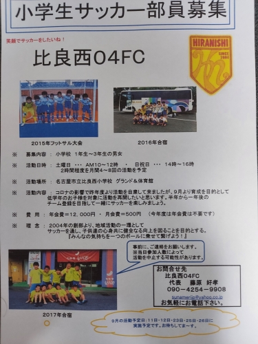名古屋市西区の比良西小学校(男・女)の児童の健全なる成長を目的に2004年に立ち上げた子供たちのサッカーチームです。 ※活動は、毎週末(毎土=9時~・日祝日=午後13時~)比良西小学校グランド(体育館)にて実施していました。一昨年度迄は年間150試合のサッカー&フットサルのゲームを中心に活動して来ましたが、コロナの影響にて約2年間活動を休止していました。 やっとですが1月中旬より活動をスタートしたいと思います。他クラブに在籍経験のある子、キッズサッカーの経験のある子・全く経験のない子、男女・経験は問いません、一緒にチームを作って行きましょう。 当面は、月間4~8日・土曜日は9~12時・日祝日は13~17時の間で2時間半程度の活動予定です。 年会費は今期は不要です。スポーツ保険料1,000円のみ・月会費は500円です(1月は無料体験月間です)。 *お気軽に、お問合せ下さい。お待ちしております。