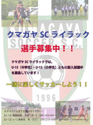 http://s-kibe.wixsite.com/kumagaya-sclilac/single-post/2018/10/22/%E3%82%AF%E3%83%9E%E3%82%AC%E3%83%A4SC%E3%83%A9%E3%82%A4%E3%83%A9%E3%83%83%E3%82%AFU-15%E3%80%81U-12%E6%96%B0%E5%85%A5%E4%BC%9A%E9%81%B8%E6%89%8B%E5%8B%9F%E9%9B%86%EF%BC%81%EF%BC%81